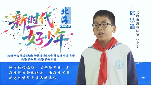 为深入学习贯彻习近平新时代中国特色社会主义思想,全面贯彻落实党的二十大和二十届二中、三中全会精神,培育和践行社会主义核心价值观,帮助未成年人“扣好人生第一??圩印?,北海市文明办、市教育局、团市委、市妇联、市关工委联合开展2025年度北海市“新时代好少年”推荐选树活动,全市共有20名学生荣获2025年度北海市“新时代好少年”荣誉称号。即日起开设“新时代好少年”事迹展播专栏,让我们一起走近“新时代好少年”,聆听他们的成长故事、感受他们的时代风采,以榜样为示范,引领全市青少年共同争做爱党爱国、自立自强、奋发向上的新时代好少年。