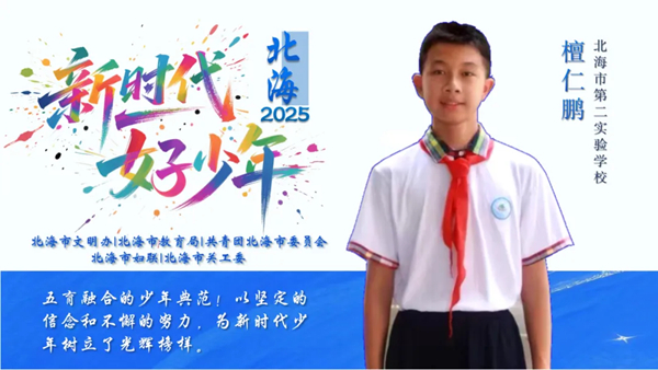 为深入学习贯彻习近平新时代中国特色社会主义思想,全面贯彻落实党的二十大和二十届二中、三中全会精神,培育和践行社会主义核心价值观,帮助未成年人“扣好人生第一粒扣子”,北海市文明办、市教育局、团市委、市妇联、市关工委联合开展2025年度北海市“新时代好少年”推荐选树活动,全市共有20名学生荣获2025年度北海市“新时代好少年”荣誉称号。自2025年6月30日起开设“新时代好少年”事迹展播专栏,让我们一起走近“新时代好少年”,聆听他们的成长故事、感受他们的时代风采,以榜样为示范,引领全市青少年共同争做爱党爱国、自立自强、奋发向上的新时代好少年。