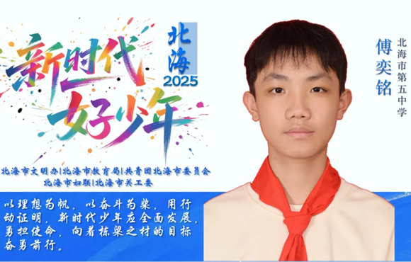 为深入学习贯彻习近平新时代中国特色社会主义思想,全面贯彻落实党的二十大和二十届二中、三中全会精神,培育和践行社会主义核心价值观,帮助未成年人“扣好人生第一??圩印保焙J形拿靼?、市教育局、团市委、市妇联、市关工委联合开展2025年度北海市“新时代好少年”推荐选树活动,全市共有20名学生荣获2025年度北海市“新时代好少年”荣誉称号。自2025年6月30日起开设“新时代好少年”事迹展播专栏,让我们一起走近“新时代好少年”,聆听他们的成长故事、感受他们的时代风采,以榜样为示范,引领全市青少年共同争做爱党爱国、自立自强、奋发向上的新时代好少年。