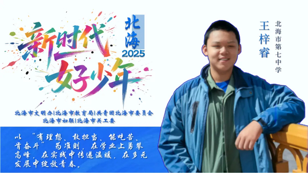 为深入学习贯彻习近平新时代中国特色社会主义思想,全面贯彻落实党的二十大和二十届二中、三中全会精神,培育和践行社会主义核心价值观,帮助未成年人“扣好人生第一??圩印保焙J形拿靼?、市教育局、团市委、市妇联、市关工委联合开展2025年度北海市“新时代好少年”推荐选树活动,全市共有20名学生荣获2025年度北海市“新时代好少年”荣誉称号。自2025年6月30日起开设“新时代好少年”事迹展播专栏,让我们一起走近“新时代好少年”,聆听他们的成长故事、感受他们的时代风采,以榜样为示范,引领全市青少年共同争做爱党爱国、自立自强、奋发向上的新时代好少年。