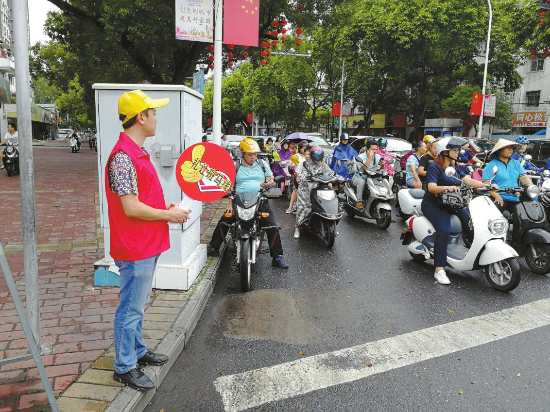 工人先锋号志愿者站在路口,引导、示意过往车辆和行人遵守交规,礼让出行。 许伟华 摄