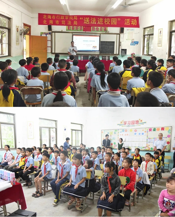 为宣传新修订的《中华人民共和国未成年人保护法》《中华人民共和国预防未成年人犯罪法》及其他相关法律法规,深入贯彻落实习近平总书记关于加强社会主义精神文明建设重要论述和党中央关于加强未成年人?;すぷ鞯木霾卟渴穑徊皆銮课闯赡耆死硐胄拍罱逃?、思想道德意识和法治意识,培育和弘扬社会主义核心价值观,助力乡村振兴,市行政审批局和市司法局10月9日下午在合浦县廉州镇青山小学联合开展“送法进校园”志愿服务活动。