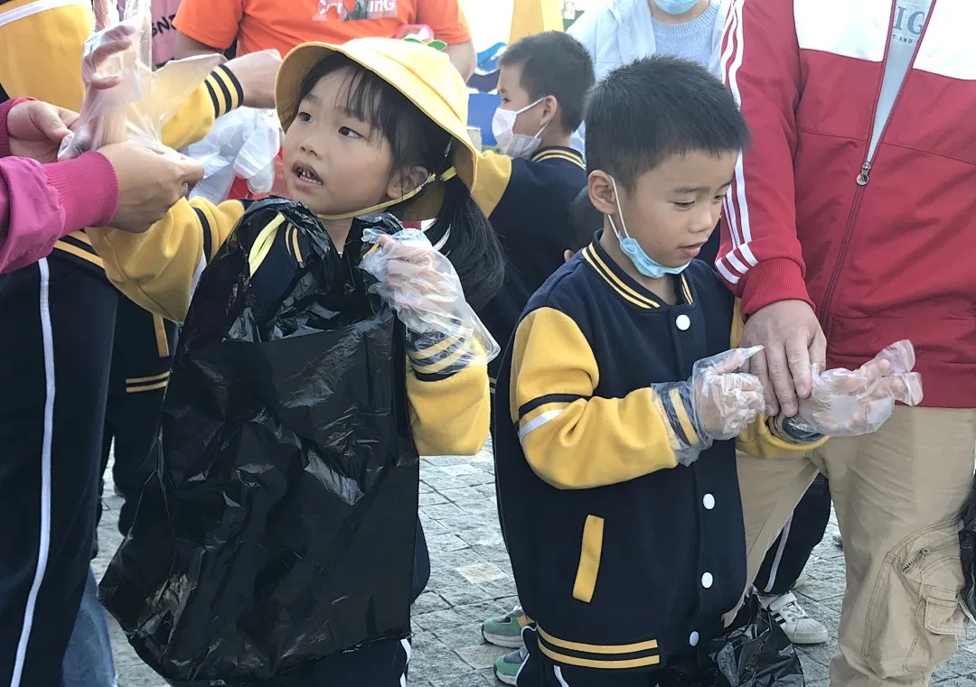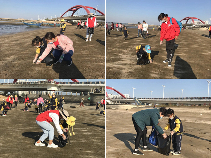 在海滩上,家长和小朋友志愿者们拿着各自的劳动工具劳作起来。他们一手拿着铁夹子,一手拿着塑料袋,沿着高德古镇旁的海岸线,边走边清理着海滩上的垃圾,并在家长及老师的指导下细心装入垃圾袋中带走处理。经过一个小时的奋战,海滩变得愈加整洁干净。