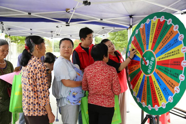 村民围绕大转盘参与“一约四会”知识问答游戏。大家兴致勃勃,在轻松愉快氛围中参与游戏赢取积分。 郭泽玲 摄