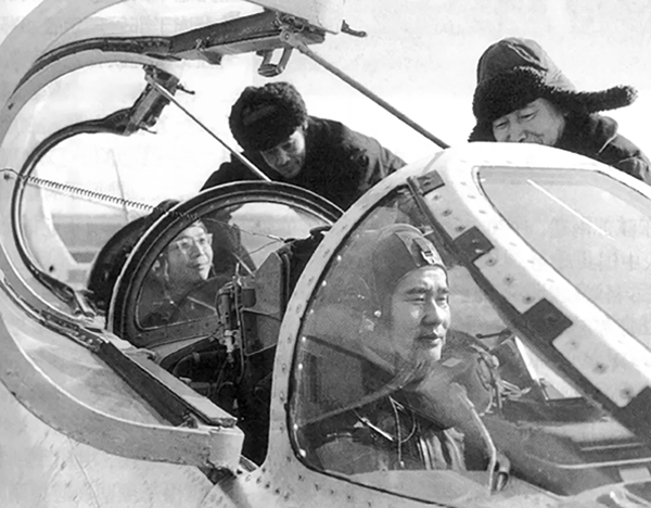 1978年,为了找到歼8飞机的抖振问题,时年48岁的顾诵芬(后)瞒着妻子,准备乘歼教6起飞。(资料图片)