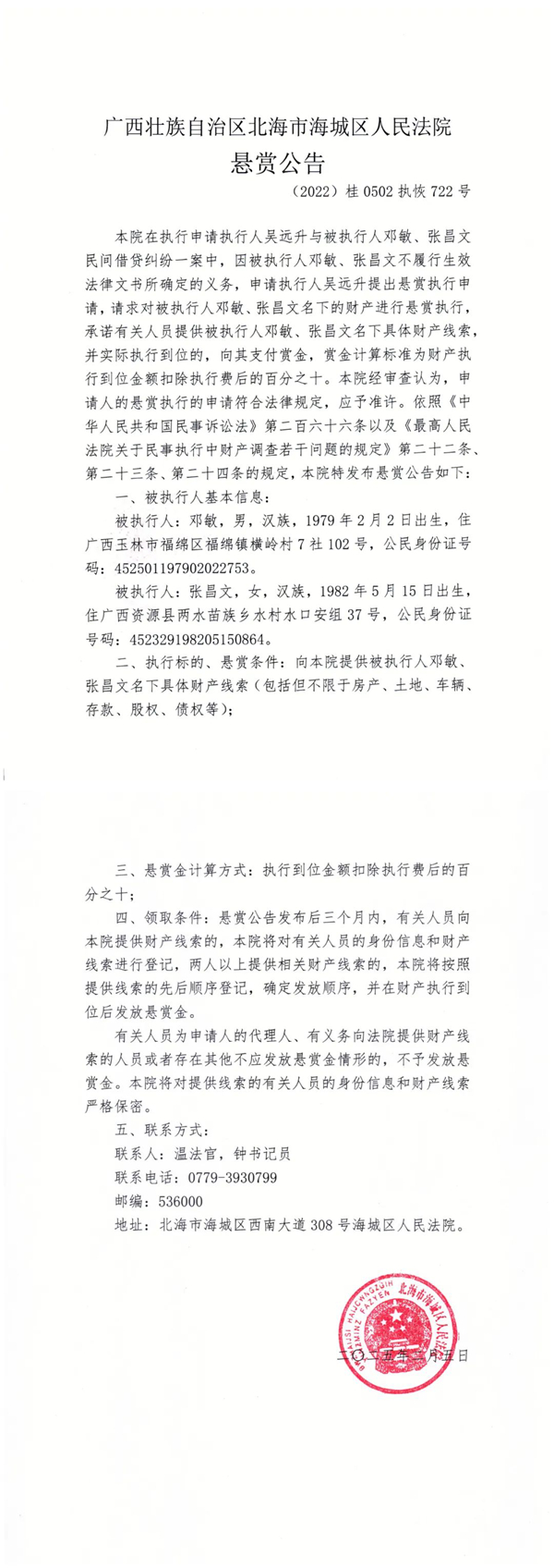 二、执行标的、悬赏条件:向本院提供被执行人邓敏、张昌文名下具体财产线索(包括但不限于房产、土地、车辆、存款、股权、债权等);