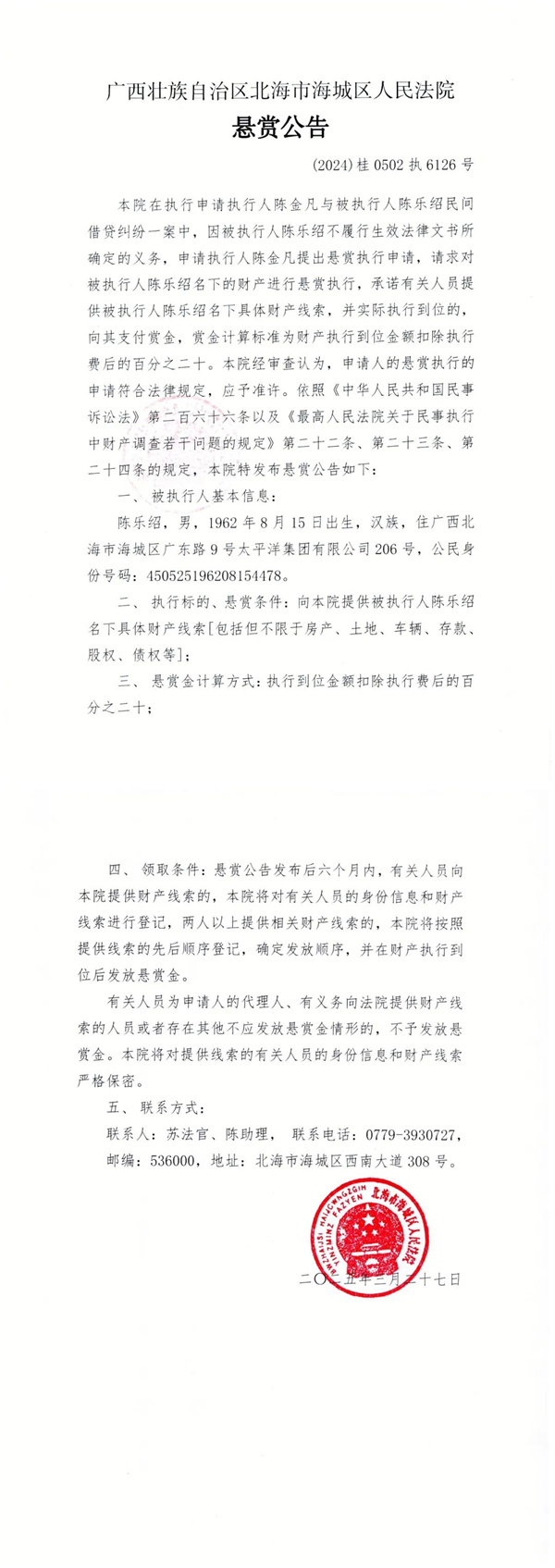 二、执行标的、悬赏条件:向本院提供被执行人陈乐绍名下具体财产线索[包括但不限于房产、土地、车辆、存款、股权、债权等];
