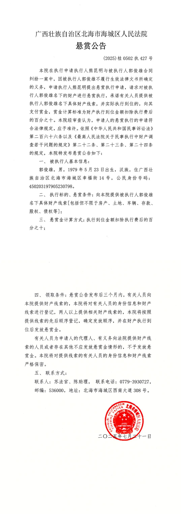 二、执行标的、悬赏条件:向本院提供被执行人郭俊雄名下具体财产线索[包括但不限于房产、土地、车辆、存款、股权、债权等];