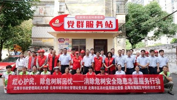 7月17日,北海市市政管理局机关党委、市城市绿化管理站党支部、北海市区农村信用联社党委、海城区中街街道党工委在科委宿舍小区联合开展消除危树安全隐患志愿服务行动,正式启动“红心护民,除危树解民忧”党建项目,该民生项目覆盖中街街道所有社区,将切实为辖区居民清除危树安全隐患。北海市市政管理局机关党委专职副书记赵玲,中街街道党工委书记廖烈芳,北海市区联社党委委员、纪委书记、监事长闭世华出席活动。各相关单位党员及志愿者40余人参加活动。